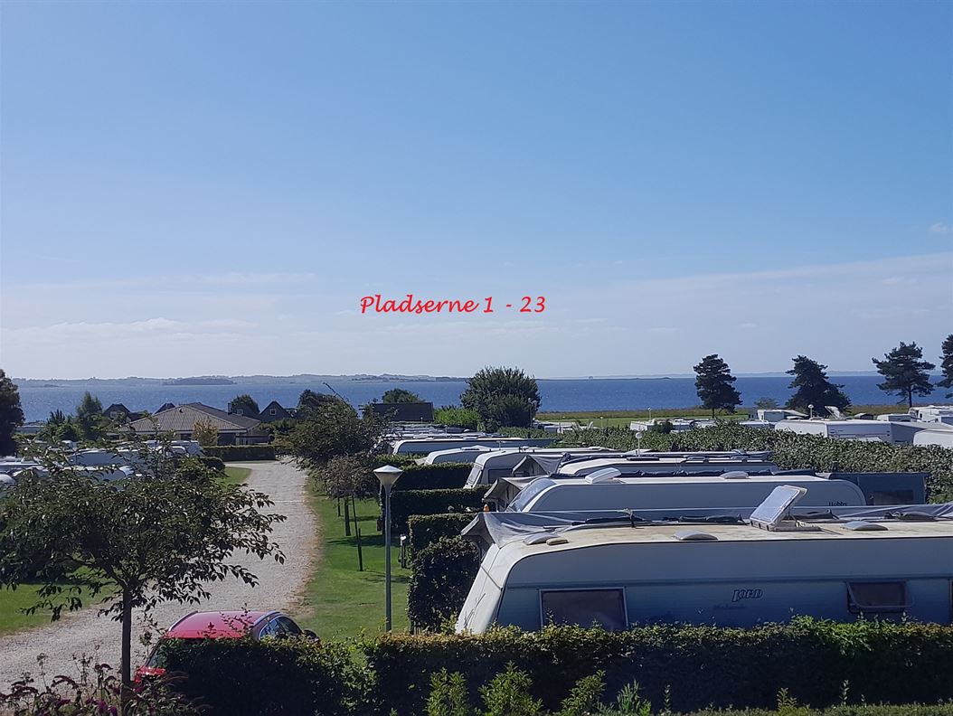 Fra mange af pladserne er der god udsigt over Helnæs Bugten og ikke langt til servicebygningerne.